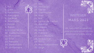 Non seulement j'ai sorti les micronouvelles de mars sur Mastodon et sur Bluesky (thème Capes et Épées, les gens de Bluesky étaient bien inspirés ! Faites une recherche sur le flux), mais en plus j'ai enfin libéré un document qu'il était temps de déclassifier : l'intégrale 2023 de ma participation au défi.